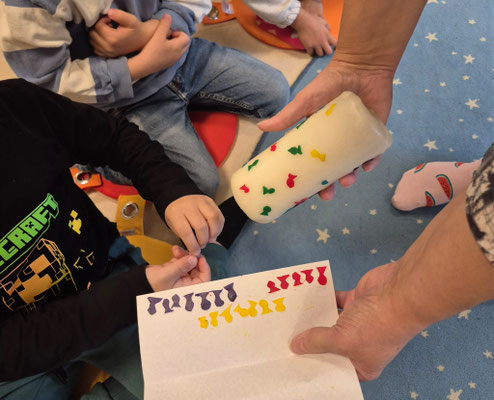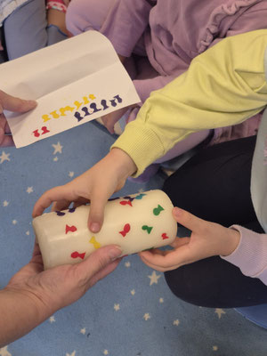 Zum Abschluss haben die Kinder die Gruppen-Kerze mit Fischen beklebt.